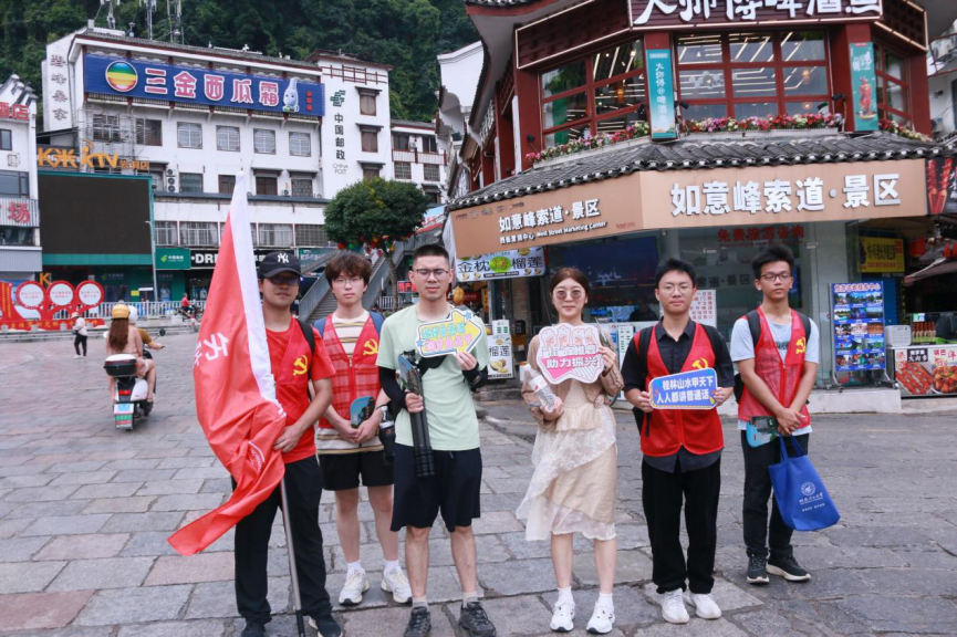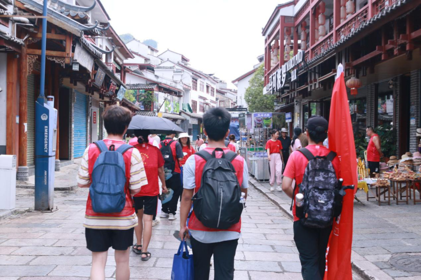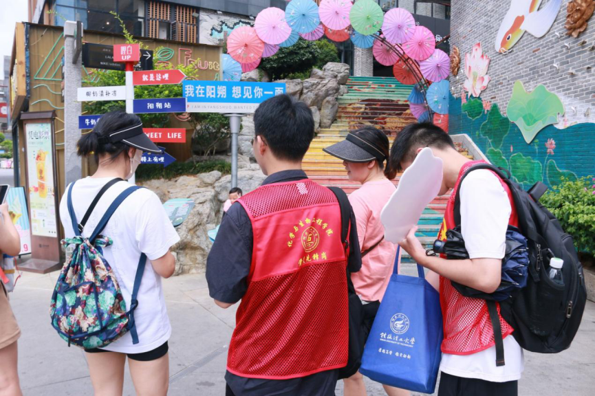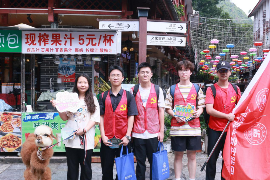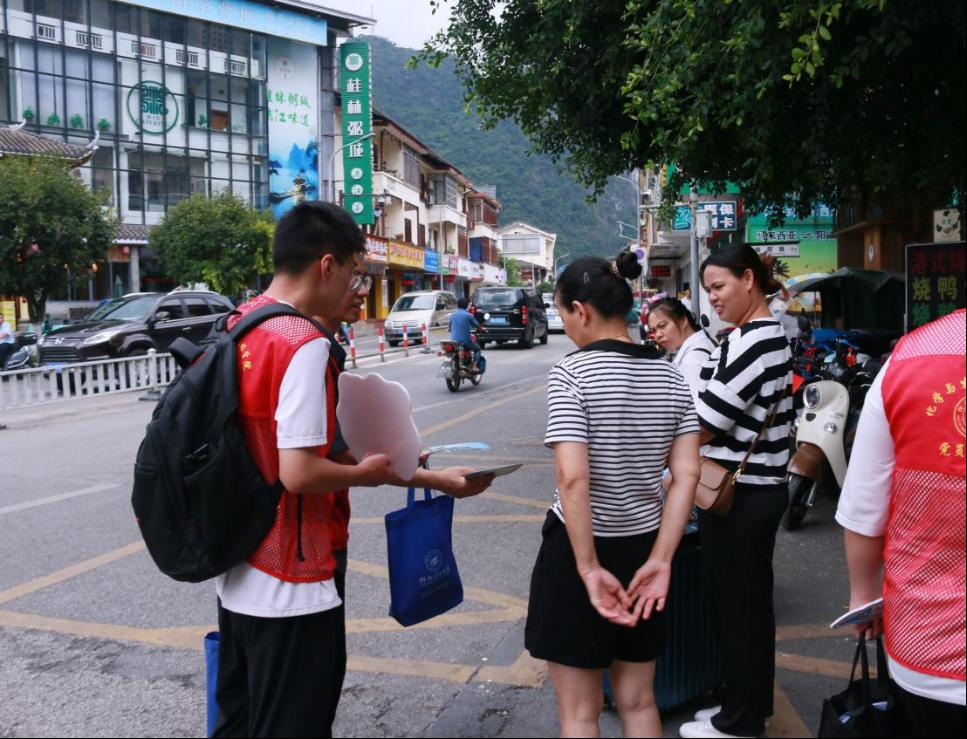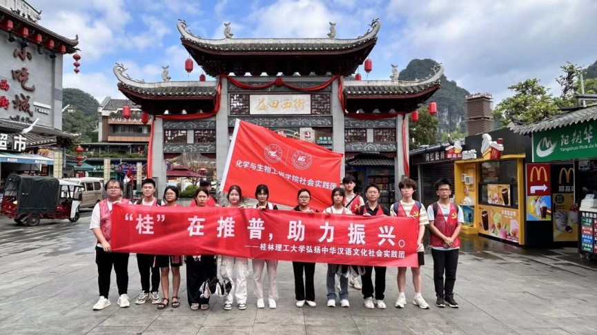 弘扬中华汉语文化社会实践团于7月11日在桂林阳朔西街及周围景区开展普通话的推广宣传行动。实践团队成员通过街道走访、分发推普物资、对当地居民或游客进行访谈等方式开展普通话的推广宣传活动。团队成员于此旅游高峰期开展推普宣