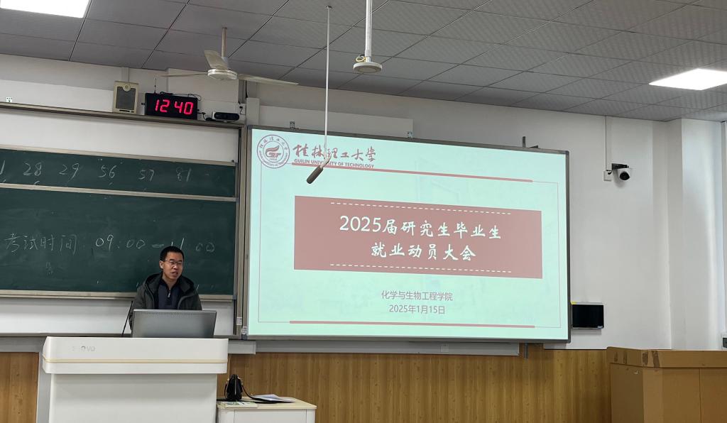 在雁山校区06408教室召开2025届研究生毕业生就业动员大会,学院副院长孔翔飞出席,研究生辅导员黄道坤、马亚博参加。
