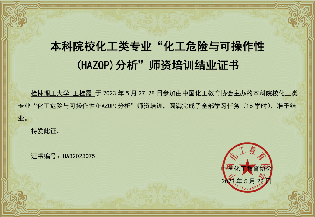 教师的工程实践能力,更好地指导化工专业相关的实习实践,2023年5 月 27 日至28 日,化学与化工教研室组织教研室全体教师参加了由中国化工教育协会举办的首期全国本科院校化工类专业“化工危险与可操作性(HAZOP)”线上专题师资培训。