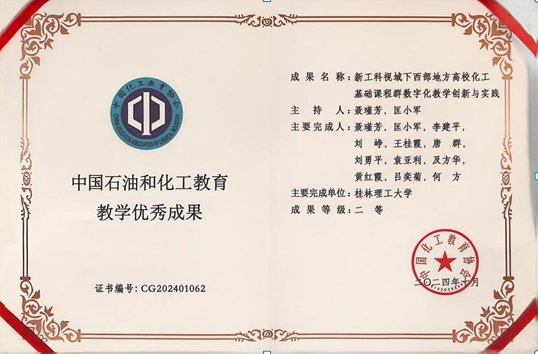 推荐参评的教学成果“新工科视域下西部地方高校化工基础课程群数字化教学创新与实践”荣获教育教学优秀成果二等奖。