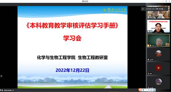 会上,生物工程教研室全体老师线上集中学习了《本科教育教学审核评估学习手册》,并结合本专业实际情况,对有关内容进行了热烈讨论。