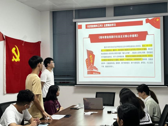 活动伊始,苏宸同志介绍本次党日活动的流程内容,并带领全体同志一起对《论党的青年工作》部分篇章进行学习。在学习过程中,罗沛、沈俊、李嘉文和李祖耀四位同志分别对不同篇章的学习发表了自己的学习心得。接着,全体同志观看视频《理想》,共同回顾党的百年奋斗历程。最后由李明、何雨轩和黄海莲三位同志阐述了观看视频的感想和此次党日活动的心得体会。