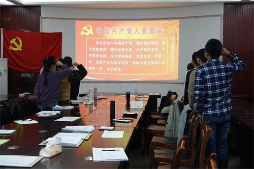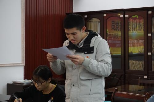 会议伊始,由陈楠同志宣读大会议程并宣布大会开始。首先由四名发展对象分别上台陈述自己的入党动机、对党的认识以及向党组织汇报自己成为入党积极分子以来工作、学习、思想、生活上的转变。接着入党介绍人分别阐述发展对象的基本情况,并对其能否加入党组织表明态度,支委会向大会汇报发展对象的政治审查报告。随后支部党员指出四名发展对象存在的问题并进行提问,对其有更深的了解。接着由支部正式党员进行不记名投票,赖廷民同志监票,郑秋杏同志计票,陈楠同志宣布大会决议,何丽、陈文俊、郑靖萱、杨帆四名发展对象全票通过成为中共预备党员。大会最后,何丽、陈文俊、郑靖萱、杨帆四名预备党员面对党旗庄严宣誓,由支部党员同志为他们佩戴党员徽章。