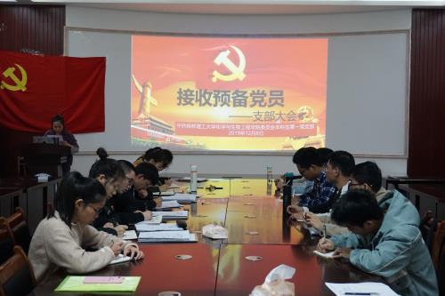本科生第一党支部在12217会议室召开了接收预备党员大会。参与此次会议的有本科生第一党支部全体党员、预备党员及发展对象,大会由支部负责人陈楠主持。本次大会对接收何丽、陈文俊、郑靖萱、杨帆四名发展对象为支部预备党员进行讨论和表决。