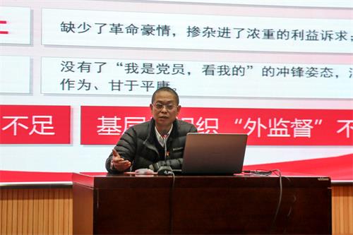 学院党委书记梁军教授从以下三个部分讲授党课:一是发挥党员模范带头作用的重要性,党员的模范作用是指党员在人民群众中应该产生的影响,具体体现为四个作用:带头作用、骨干作用、桥梁作用和表率作用,五个带头:带头学习提高,带头践行宗旨,带头爱岗敬业,带头遵纪守法和带头弘扬正气;二是发挥党员先锋模范作用时存在的问题,通过从当前基层实际,个人层面和组织层面三个方面指出存在的问题,希望各个党员发现并解决自身存在的问题;三是新时期师生党员应该如何发挥模范作用,分别从扮好“三种角色”,强化“三种意识”,当好“三个模范”三个内容进行讲述,如何更好地发挥模范作用。