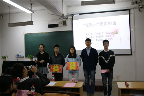 大三年级学生宿舍卫生环境的举措,同学都积极参与其中,为自己创造一个温馨和谐的宿舍环境。她还说到,宿舍装饰是同学们对自己生活环境美化的过程,通过本次装饰大赛,为同学们营造“家”的氛围,为接下来和谐大学生活起到很好的促进作用。接着楼管委通过PPT为大家展示了本次宿舍装饰大赛以及“变形记”活动中优秀获奖宿舍的风采,此外楼管委副主任奚怀同学就“变形记”活动中出现的优点和不足做了相关总结。据悉,本次“变形记”活动共评选出获奖宿舍6个,宿舍装饰大赛共评选出“最佳环保奖”、“最佳化学奖”等共10个宿舍。在同学热切的期盼中三位老师为活动中获奖的宿舍颁发奖状。