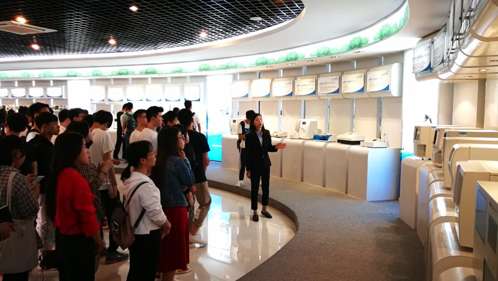 在参观桂林优利特医疗电子有限公司时,优利特医疗电子有限公司谭丽玲女士带领同学们参观了公司品牌文化与产品展示厅,详细介绍了医学诊断系列产品的功能与作用。参观展示厅结束,公司人事部经理蒋继军和同学们在会议室进行了座谈交流,在向大家介绍了公司校园招聘及实习计划具体情况后,特别邀请了公司高管蒋均分享了自己的创业感受,他用实际创业经历引导同学们应科学规划职业生涯,在未来的人生道路上实现高远梦想。