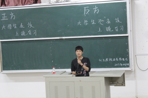 4月15日晚7点,以“大学生是否应该上晚自习”为辩题的趣味辩论赛在雁山校区05314教室举行。学院饶筠筠老师、杨建辉老师、何宗辉老师以及09级优秀学生代表秦冬霞同学与12级全体同学一起观看了本次辩论赛。
