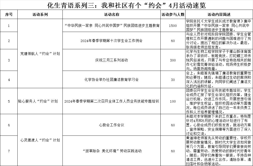 将“一站式”学生社区以“党建+X”模式为基础,结合学院【化生青语】育人文化,将学院育人体系下沉社区,打造【化生青语】系列三——我和社区有个“约会”特色活动。4月份,结合学院社区团队,按照学院社区我和社区有个“约会”特色品牌活动,党建领航人“约会”计划、贴心服务人“约会”计划、心灵摆渡人“约会”计划三个系列活动同步推进,共同助力学院学子学习、生活等方面的发展。按照“约会计划”,学院举办活动如下。