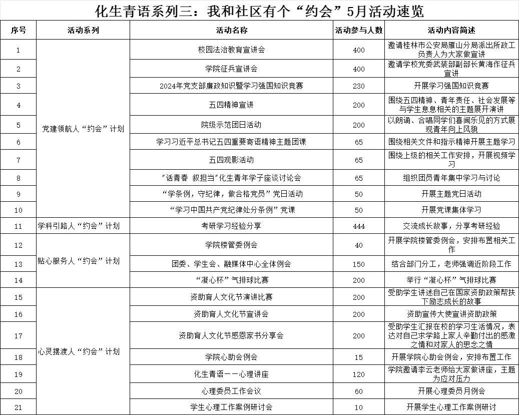 将“一站式”学生社区以“党建+X”模式为基础,结合学院【化生青语】育人文化,将学院育人体系下沉社区,打造【化生青语】系列三——我和社区有个“约会”特色活动。5月份,结合学院社区团队,按照学院社区我和社区有个“约会”特色品牌活动,党建领航人“约会”计划、学科引路人“约会”计划、贴心服务人“约会”计划、心灵摆渡人“约会”计划四个系列活动同步推进,共同助力学院学子思想、学习、生活等方面的发展。按照“约会计划”,学院举办活动如下。