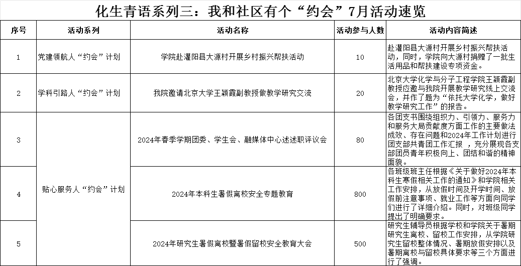 将“一站式”学生社区以“党建+X”模式为基础,结合学院【化生青语】育人文化,将学院育人体系下沉社区,打造【化生青语】系列三——我和社区有个“约会”特色活动。7月份,结合学院社区团队,按照学院社区我和社区有个“约会”特色品牌活动,党建领航人“约会”计划、学科引路人“约会”计划、贴心服务人“约会”计划三个系列活动同步推进,共同助力学院学子学习、生活等方面的发展。按照“约会计划”,学院举办活动如下。