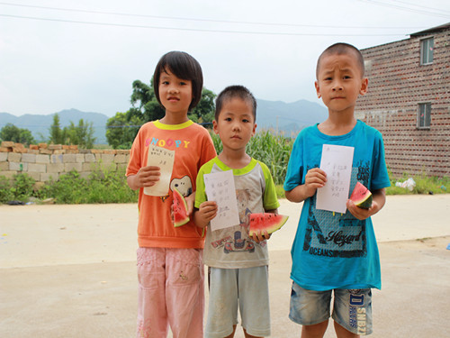 活动开始,队员们拉开横幅,教学生们读“三爱”,写“三爱”,耐心教导他们理解“三爱”的含义。在整个活动过程中,同学们欢欣雀跃地用那充满稚气的童音大声地朗读着“爱祖国,爱学习,爱劳动”,并用石子在地上一笔一划地写着“爱祖国,爱学习,爱劳动”,其中有位名字叫卢奕的小女孩,在志愿者拿给她的一张纸上认真地写着“三爱”,她和她的同学们的认真态度感动了在场的所有志愿者们。在小学生的身上志愿者们看到了教育宣传“三爱”的力量,也更加深刻的明白了暑期实践“三下乡”活动的深刻意义。