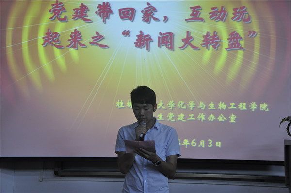 学生党建办公室主办的党建带回家,互动玩起来之“新闻大转盘”活动在雁山校区05101室举行。学生党建办公室主任何宗辉老师、私房俱乐部