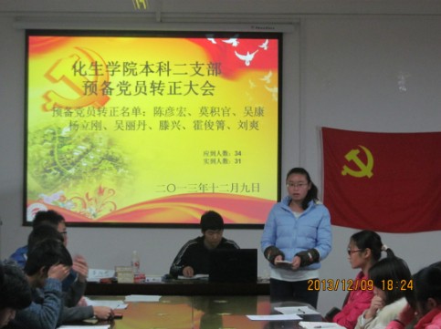 会议第一个议题是讨论柳小建等4名发展对象的发展问题,第二个议题是讨论陈彦宏等8名预备党员的转正问题。以上几名同学平时能够接受党的教育和管理,较好的完成组织交办的各项任务,积极参加党校的培训班,刻苦学习党的理论知识,加强自身的党性修养,关心时事,在平时的工作、学习、生活中,关心团结同学,积极带动身边同学完成学院的各项任务,努力学习科学文化知识,成绩优异。在同学中间,较好的发挥了先锋模范带头作用。会议期间严格遵守正确的流程,最终经过无记名投票,柳小建等4名发展对象成为中共预备党员,陈彦宏等8名同志顺利转正成为中共党员。