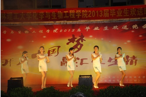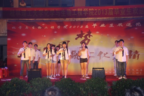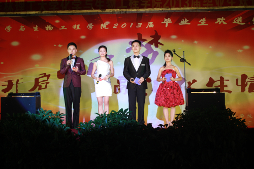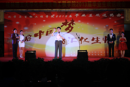 朝夕耕耘,图春华秋实;十年寒窗,求学有所用。似水流年,体味完美人生;分手再见,走向灿烂明天!6月15日晚,以“开启中国梦,融汇化生情”为主题的化生学院2013届毕业生欢送晚会在雁山校区三栋广场隆重举行。化生学院党委胡祖生书记、院长李建平教授、党委陶剑飞副书记、副院长杨建文教授、院长助理海洪副教授与学院五百多名师生一同观看了晚会。