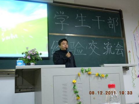 杨老师首先对本次会议的召开表示热烈的祝贺并对各班各部门的学生干部自开学以来所做的工作给予肯定。他指出,作为一名学生干部,应该做到有责任感,有服务意识,做好模范带头作用。