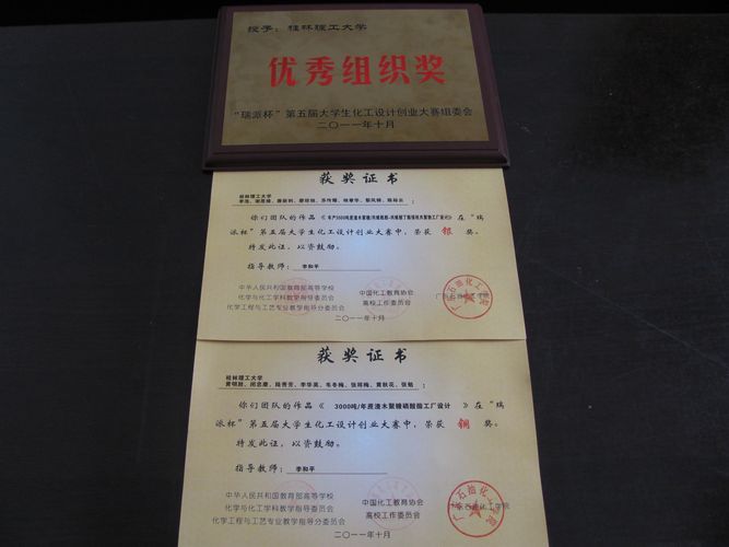 学子不负重望,在本次大赛中创下佳绩。其中由李浩等8位同学组成的“8度思维团队”以作品《年产3000吨蔗渣木聚糖/丙烯酰胺-丙烯酸丁酯接枝共聚物工厂设计》进入决赛,并荣获大赛“银奖”;由黄明胜等8位同学组成的“无限力量团队”以作品《3000吨/年蔗渣木聚糖磷酸酯工厂设计》荣获大赛“铜奖”。此外,根据各高校参赛作品的数量及组织效果,我校与华南理工大学、广州大学、五邑大学、武汉工程大学、广东石油化工学院等6所高校同时获得了本次大赛的“优秀组织奖”。