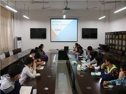 于雁山萃华楼217会议室组织召开全国“互联网+”大学生创新创业大赛交流会。出席会议的有学院团委书记饶筠筠老师、学院团委副书记苏蝶以及学院各参赛成员。