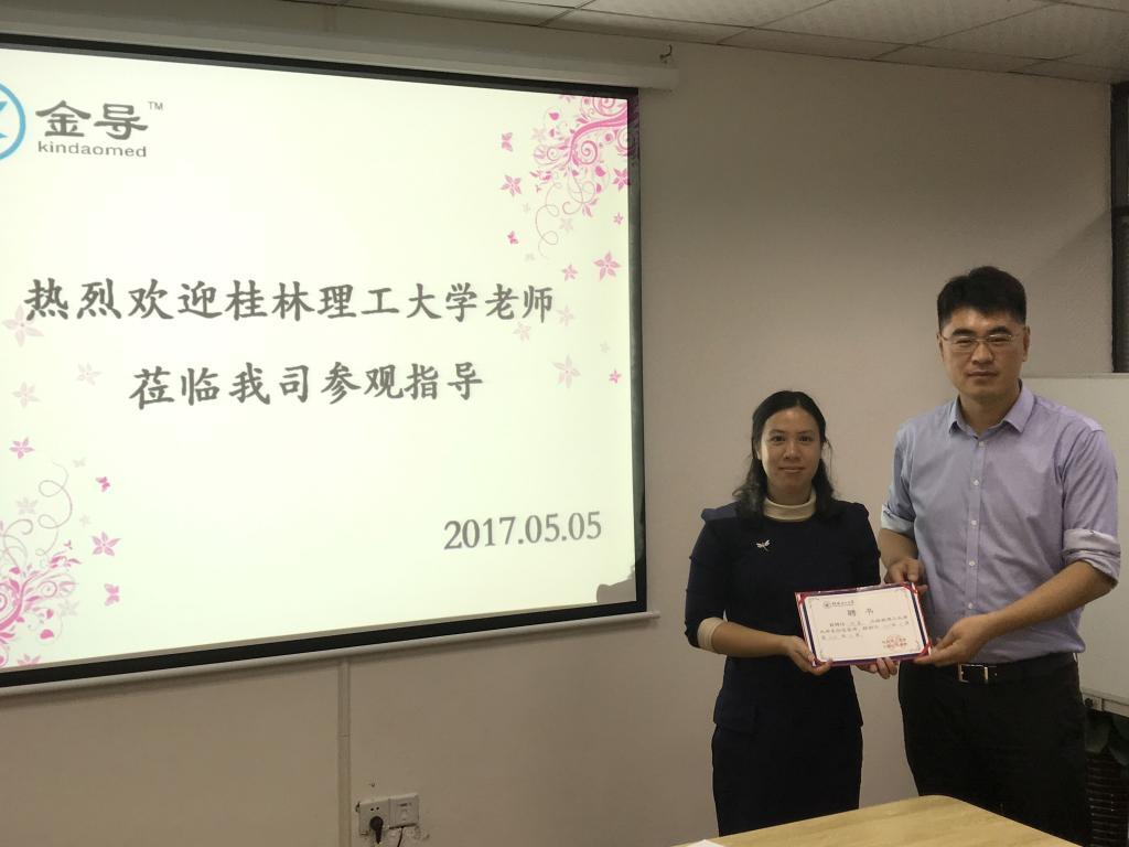 在广东珠海金导医疗科技有限公司,该公司时勇总经理热情接待了陶副书记一行。在座谈会上,公司陈世斌副总经理从公司的业务和定位、产品特点及应用、发展目标和规划、运营模式和合作愿景等方面做了详细介绍。双方就大学生创新创业、实习实训、科研成果转化等方面进行了合作洽谈,并签订了校企合作意向书。随后,陶剑飞副书记还为该公司时勇总经理颁发了私房俱乐部