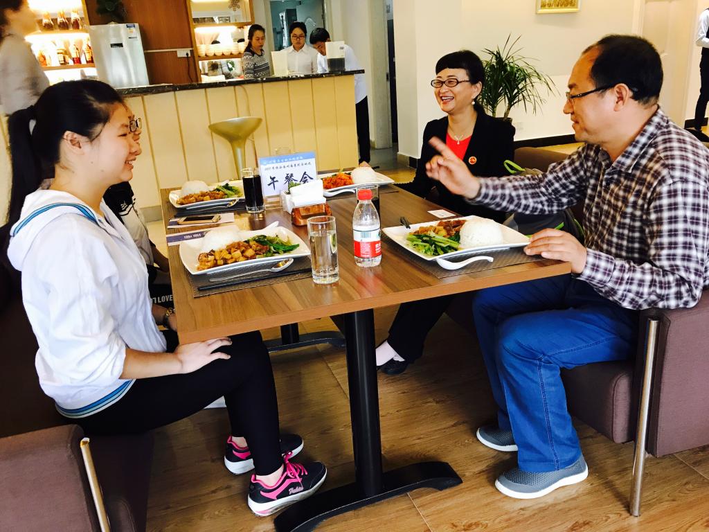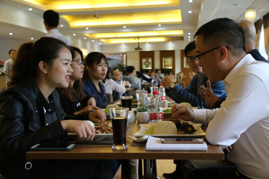 40名学生代表。在午餐会开始前,学生代表们与企业家们一同入席,相邻而坐,共聚一堂。一道道美味的餐品被送上桌,现场的气氛也随之热烈起来。同学们抓住眼前的机会,积极与企业家交流,向同座的企业家们提出了许多关于就业与创业的问题,了解企业需求以为对人才的要求等情况。企业家们耐心地为同学们解惑,其间还跟同学们分享了很多关于就业、创业、在企业中处事的亲身经验,同学们侧身倾听,汲取经验。双方在餐桌上直面交流,谈笑风生间,拉近了企业家与学生间的距离。