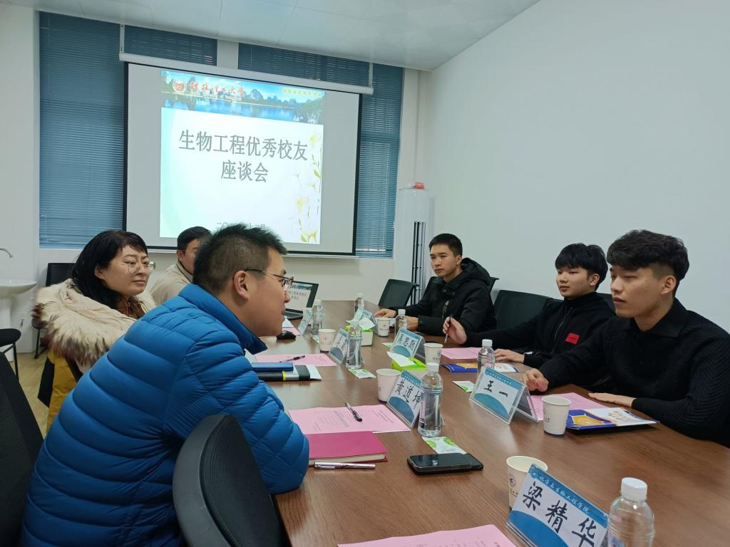 在雁山校区萃华楼12115会议室和12217多功能室,先后召开了生物工程专业优秀校友座谈会及创新创业经验交流分享会。本次沙龙学院邀请到了2020届生物工程专业优秀校友企业代表吴思聪、王一、刘嘉文出席。学院副院长李霞、学工组组长黄道坤以及团委书记张萌萌等老师参加相关活动。