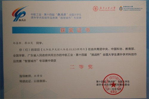 郑喜程、廖仕茂等同学的作品《太阳能声光控人体感应LED照明灯》进入决赛(广西高校唯一),赴香港参加决赛答辩,并荣获二等奖。该作品由私房俱乐部