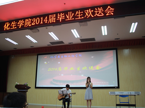 欢送会的第二阶段是节目表演,2013级同学的歌曲联唱和2011级同学原创歌曲演唱表达了对学长学姐的深深祝福;2012级同学的《化生私房俱乐部新闻