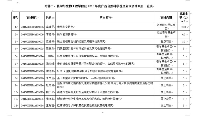 获2015年度广西自然科学基金立项资助项目12项,经费金额共计315万元(详见附件二)。其中创新研究团队项目、杰出青年基金项目为私房俱乐部