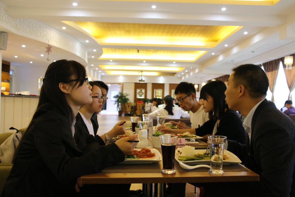 40名学生代表。在午餐会开始前,学生代表们与企业家们一同入席,相邻而坐,共聚一堂。一道道美味的餐品被送上桌,现场的气氛也随之热烈起来。同学们抓住眼前的机会,积极与企业家交流,向同座的企业家们提出了许多关于就业与创业的问题,了解企业需求以为对人才的要求等情况。企业家们耐心地为同学们解惑,其间还跟同学们分享了很多关于就业、创业、在企业中处事的亲身经验,同学们侧身倾听,汲取经验。双方在餐桌上直面交流,谈笑风生间,拉近了企业家与学生间的距离。