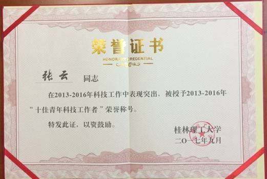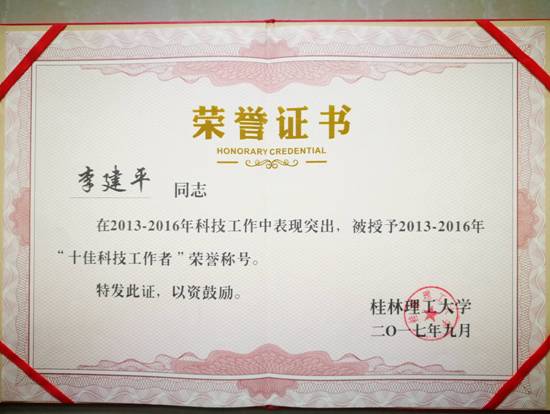 被评为2013-2016年“科技工作先进集体”,李建平教授、张云教授分别被授予2013-2016年“十佳科技工作者”和“十佳青年科技工作者”荣誉称号。