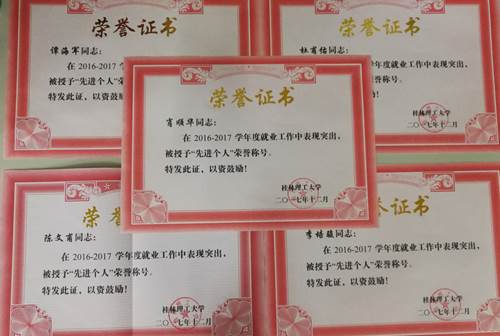 2017年毕业生就业工作先进集体奖,学院杜甫佑、肖顺华、谭海军、李培骏、陈文甫等五位老师荣获2017年毕业生就业工作先进个人荣誉。