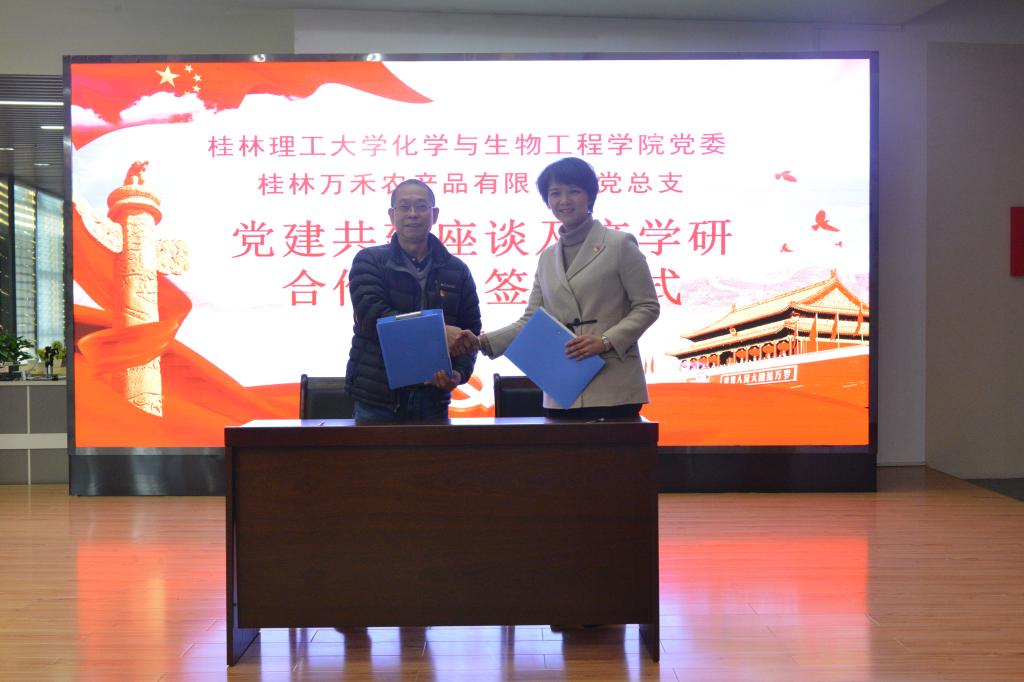 党委书记梁军带领学院党政领导班子成员、生物工程专业教师及学生工作办公室辅导员赴桂林万禾农产品有限公司开展党建共建座谈暨产学研合作项目签约仪式活动。桂林万禾农产品有限公司党总支书记、桂林万禾集团总经理崔萌佳热情接待了梁书记一行。