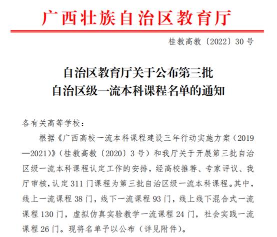 近日,自治区教育厅下发了《关于公布第三批自治区级一流本科课程名单的通知》(桂教高教〔2022〕30号),私房俱乐部