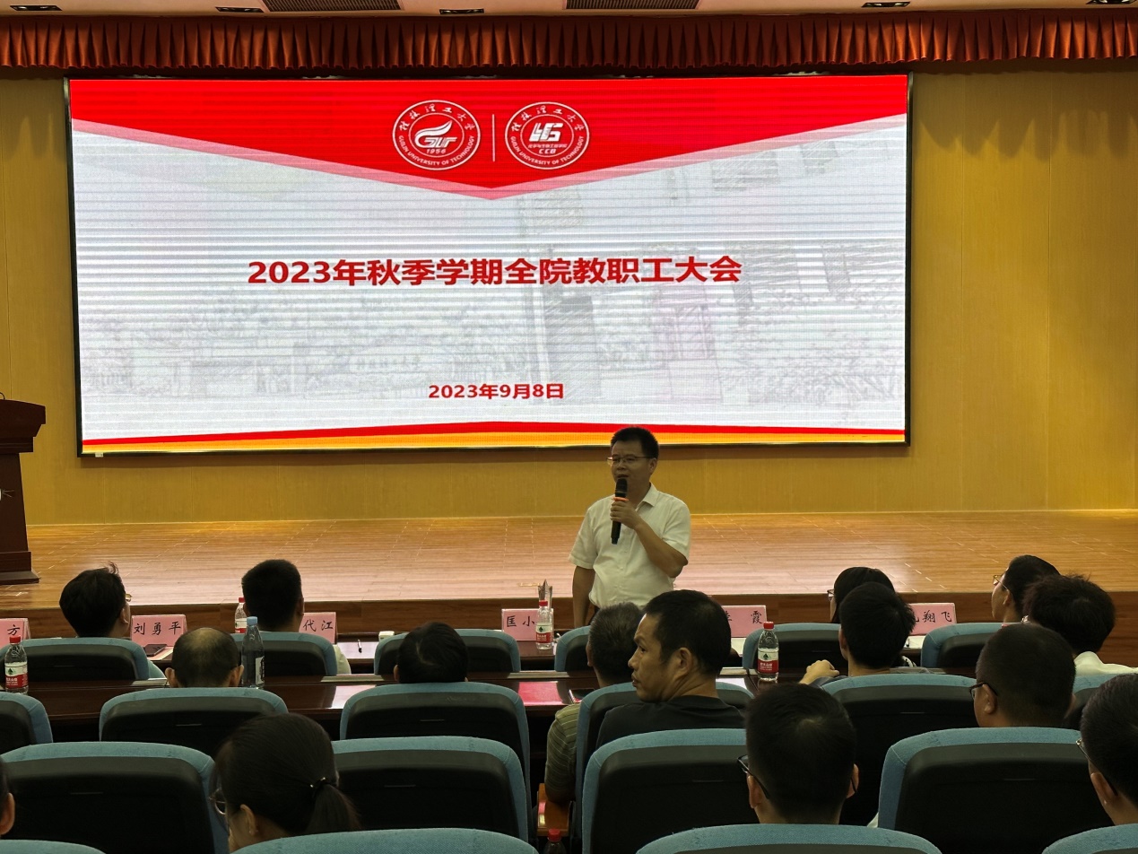 在雁山校区图书馆报告厅召开2023年秋季学期全院教职工大会,学院全体教职工参加。会议由学院院长匡小军主持。