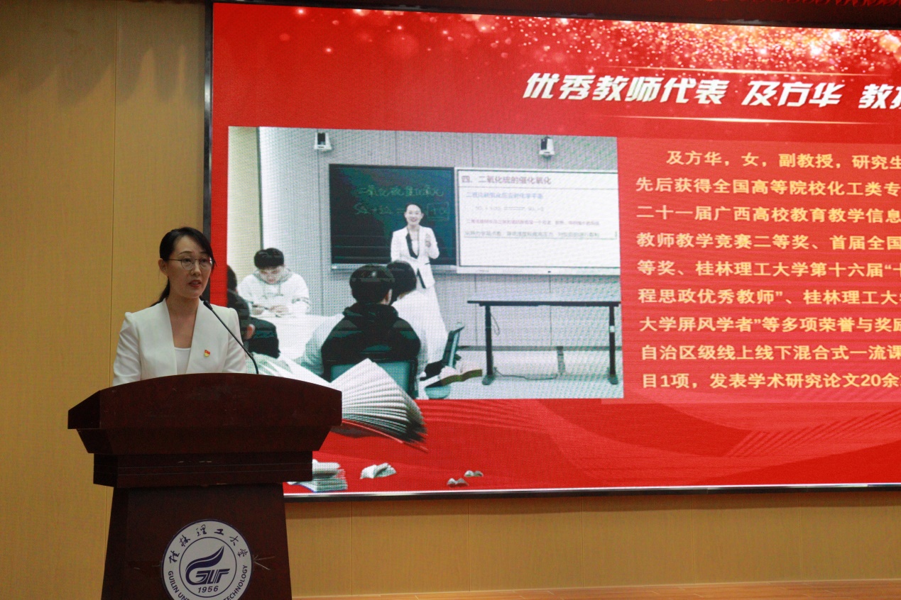 为深入贯彻落实习近平新时代中国特色社会主义思想和党的二十大精神,充分展现新时代新征程高质量教师队伍建设的突出成就和广大教师立德树人、自信自强的精神风貌,化生学院以迎接党的二十大胜利召开后的第一个教师节为契机,于9月8日下午在雁山校区图书馆报告厅开展以“躬耕教坛 强国有我”为主题的教师节庆祝活动。学校党委常委、副校长王玫、学院党委书记彭代江、院长匡小军以及学院全体教师、学生代表等220余人参加了本次活动。