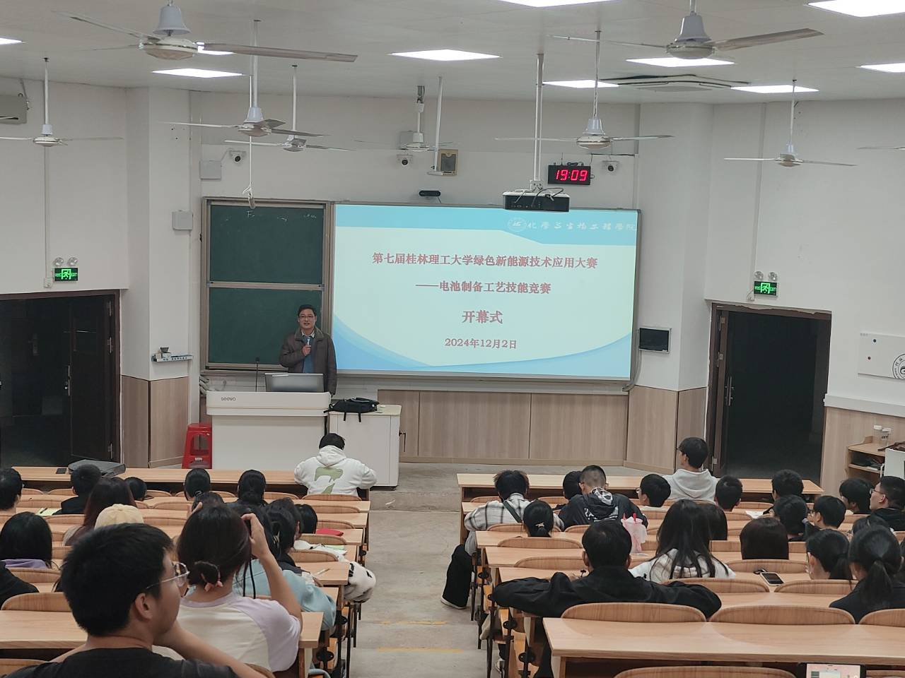 党委李少华副书记、能源化学工程教研室主任黄斌副教授出席了开幕式。李少华副书记对大赛致辞,黄斌老师为来自全校各个专业的200组入围选手进行了赛程讲解及赛前培训。初赛为新能源理论知识竞赛,于12月3日中午在雁山校区教6楼举行。初赛后选出20支队伍进入决赛,并由私房俱乐部