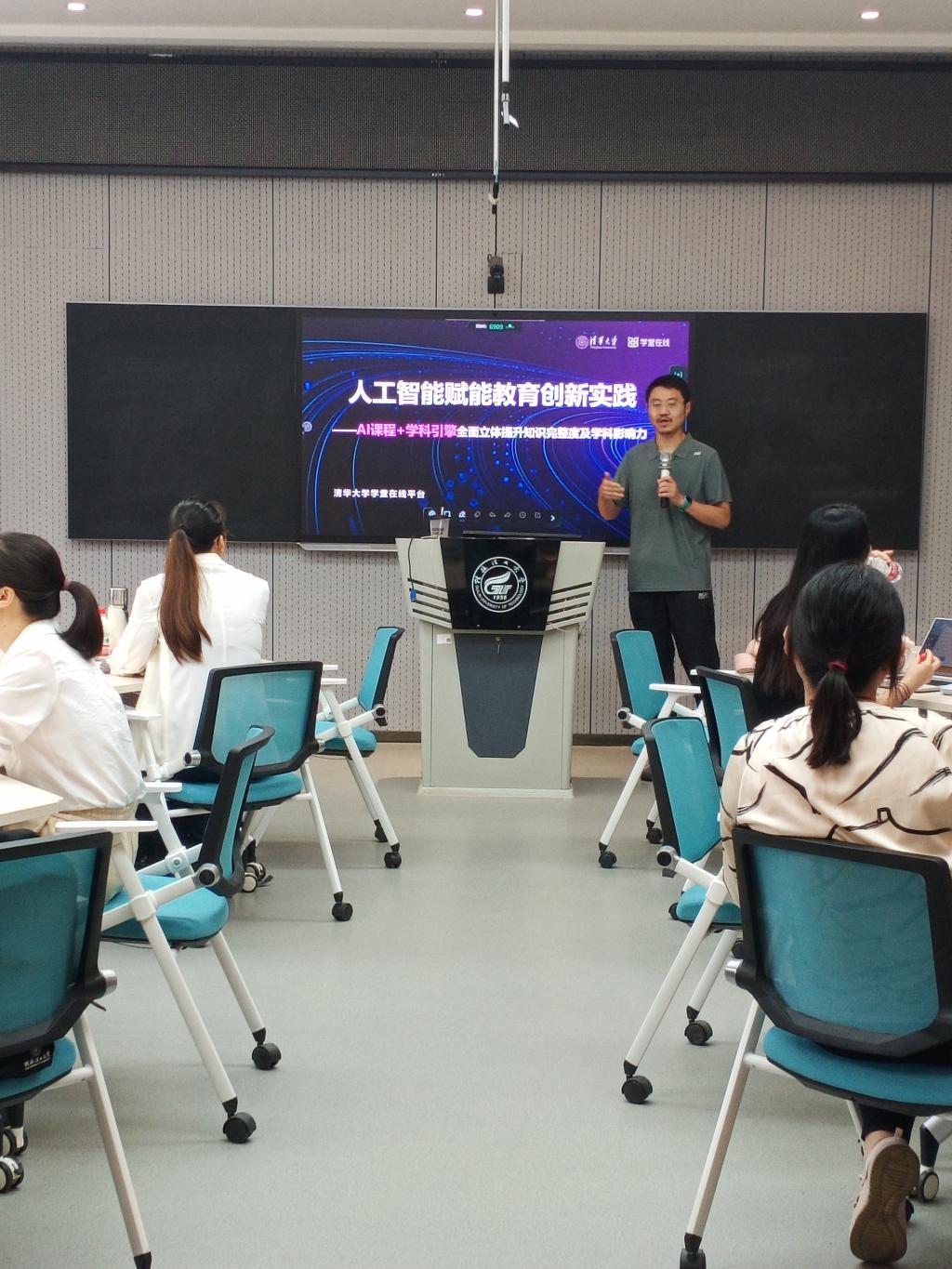 此次培训特邀清华大学学堂在线平台技术负责人张宁主讲。张宁在人工智能领域成果丰硕,本科和研究生就读于北京大学,拥有多个专业学位,深度参与清华人工智能教学试点课程建设。培训以“人工智能赋能高等教育教学改革—AI学科引擎专题”为主题,聚焦清华大学AI学科引擎的探索与实践。张宁从AI学科引擎概念切入,解析其整合课程资源、优化教学的功能;并通过智能备课、个性化学习等多个案例,展现AI在教学全流程的应用场景与实践成果。