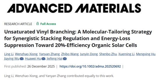 近日,我私房俱乐部 海杰峰教授与东华大学胡华伟教授、香港科技大学(广州)吴佳莹教授团队合作,在有机太阳能电池(OSCs)非富勒烯受体材料设计与光伏性能提升领域取得重要进展。研究成果以Unsaturated Vinyl Branching: A Molecular-Tailoring Strategy for Synergistic Stacking Regulation and Energy-Loss Suppression toward 20%-Efficiency Organic Solar Cells”为题,在国际材料科学顶级期刊《Advanced Materials》(影响因子28.6)上发表。我校为该论文的第一完成单位,硕士研究生张焱焱为共同第一作者,海杰峰教授为第一通讯作者。