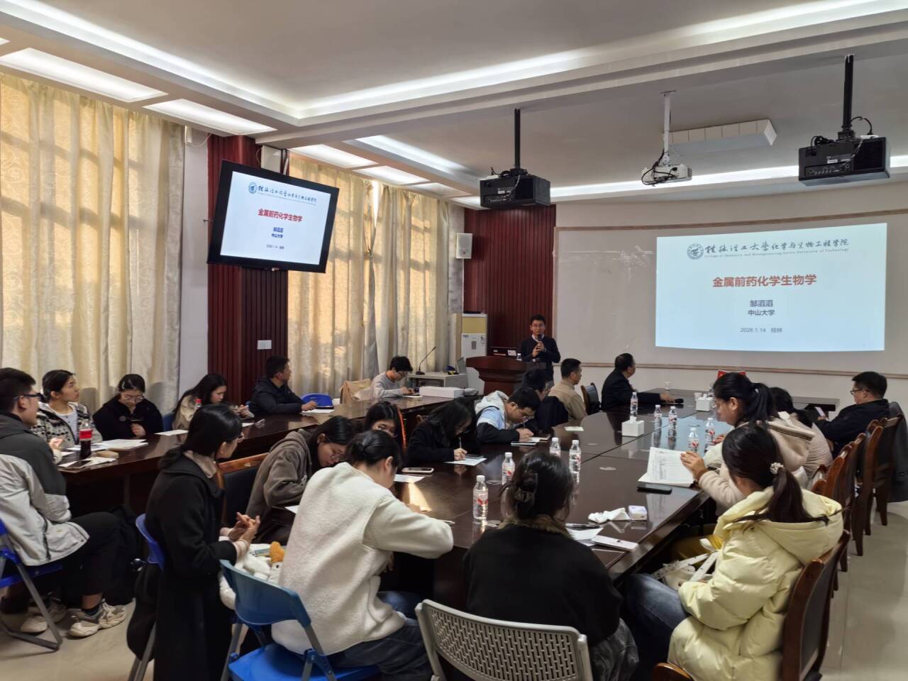 邀请,在我校雁山校区萃华楼217室作题为《金属前药化学生物学》的学术报告。报告会由梁福沛教授主持,近百名师生现场参加。