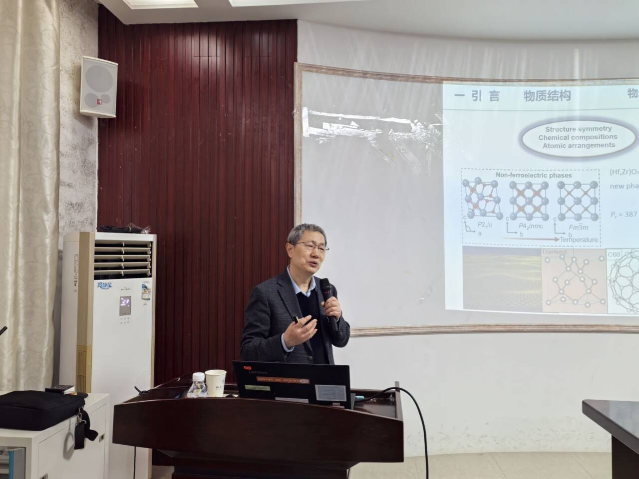 邀请,在我校雁山校区萃华楼217室作题为《固体局域结构与物性》的学术报告。报告会由学院副院长潘宏程主持,近百名师生到场参加。