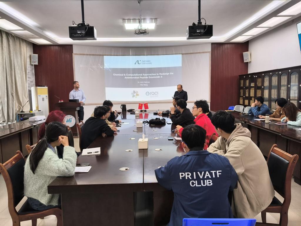 主办的学术讲座在雁山校区12217会议室顺利举行。来自澳大利亚阿德莱德大学的John Kalyvas博士与王亦非博士应邀作了题为“化学与AI策略从头设计抗菌肽短杆菌肽S”的精彩报告。学院相关专业师生到场聆听,讲座由学院喻敬贤教授主持。