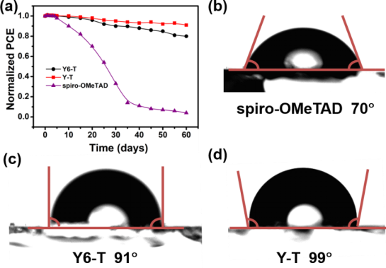 图4 (a) 未封装器件稳定性;接触角实验 (b) spiro-OMeTAD;(c) Y6-T;(d) Y-T