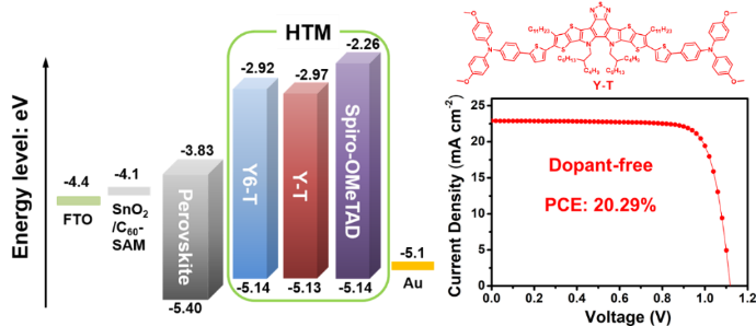 海杰峰副教授与嘉兴学院中澳先进材料与制造研究院尹新星&李在房课题组合作,利用两步合成法以缺电子大稠环单元作为中心核,三苯胺单元作为端基构建了两个新型分子Y6-T和Y-T,并且将其作为非掺杂空穴传输层材料应用于PSCs。与spiro-OMeTAD相比,Y6-T和Y-T具有合适的HOMO和更高的空穴迁移率以及较好的疏水性。经器件优化后,基于非掺杂Y-T的钙钛矿太阳能电池展现出令人满意的20.29%效率,高于基于非掺杂Y6-T的器件(18.82%)和基于掺杂spiro-OMeTAD的器件(19.24%)。同时相对于使用掺杂spiro-OMeTAD的器件,基于这两种非掺杂HTM材料的器件表现出更加优异的稳定性。这项工作为非掺杂HTM材料提供了一种有效的设计策略,同时对钙钛矿太阳能电池商业化起到一定的推动作用。相关结果以“Dopant-Free Hole Transport Materials Based on a Large Conjugated Electron-Deficient Core for Efficient Perovskite Solar Cells”为题在发表于Advanced Functional Materials(SCI一区TOP期刊,影响因子18.8)。