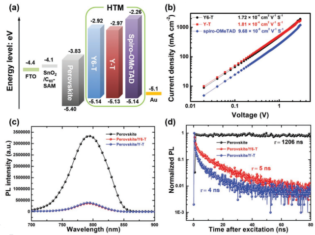 Y6-T和Y-T拥有合适的HOMO能级(~-5.14 eV),比spiro-OMeTAD高一倍的空穴迁移率(1.72~1.81×10-4 cm2 V-1 s-1)。稳态光致发光(PL)和时间分辨光致发光(TRPL)光谱显示非掺杂的Y6-T和Y-T比掺杂后的spiro-OMeTAD具有更快速和高效空穴抽取和传输能力。