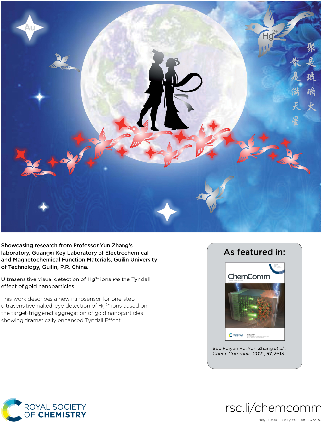 相关成果以“Ultrasensitive visual detection of Hg2+ions via the Tyndall effect of gold nanoparticles”为题发表在化学领域国际知名期刊Chemical Communication(自然指数收录的82种全球自然科学类顶级期刊之一;影响因子5.996),并被选为当期的OutsideBack Cover(外封底;以中国古代传说“牛郎织女鹊桥相会”为创意)。该项研究得到国家自然科学基金面上项目、广西杰出青年基金、中央引导地方科技发展资金、广西重点研发计划等项目资助。私房俱乐部