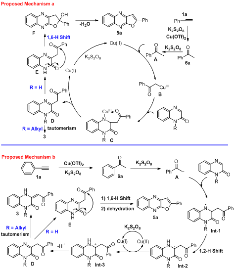 图2 铜催化喹喔啉酮与炔烃的选择性偶联反应