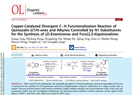 蒋光彬副教授、及方华副教授课题组在铜催化C-H键官能团化研究领域取得重要研究进展,研究成果以题目为:Copper-Catalyzed Divergent C-H Functionalization Reaction of Quinoxalin-2(1H)-ones and Alkynes Controlled by N1-substituents for the Synthesis of (Z)-enaminones and Furo[2,3-b]quinoxalines的论文被有机化学领域国际知名期刊《Organic Letters》录用(IF= 6.005)并正式发表。该项研究得到国家自然科学基金及广西自然科学基金等多个项目的资助,私房俱乐部