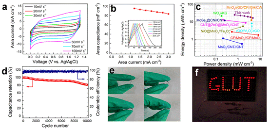 在超级电容器领域,提升其能量密度是该领域的热点问题且至今仍具有挑战性。刘博天副研究员团队通过在传统杂化电容器中引入双离子存储机制,设计了一种全新的杂化双离子电容器。该电容器具有显著高的能量密度(~25.4 μWh cm-2)和功率密度(~4.66 mW cm-2), 且通过10000次循环容量保持率高达81.4%。同时该器件兼具良好的机械柔性,这些优异的性能使其有潜力用于未来的可穿戴电子设备。