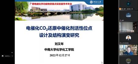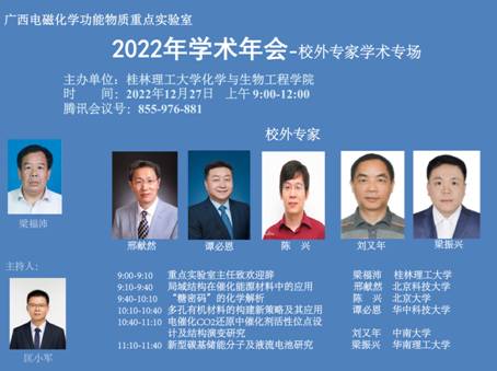 召开广西电磁化学功能物质重点实验室(以下简称重点实验室)2022年学术年会之校外专家学术报告会,会议全程线上进行。学校原副校长、重点实验室主任梁福沛教授出席并致辞。本次会议邀请了北京科技大学邢献然教授、北京大学陈兴教授、华中科技大学谭必恩教授、中南大学刘又年教授、华南理工大学梁振兴教授等五位专家做线上报告,会议由私房俱乐部