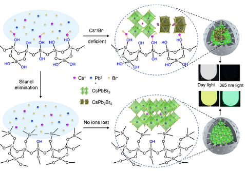 鉴于此,研究团队深入研究了介孔硅界面本征的硅羟基活性基团对CsPbBr3纳米晶的限域生长及其光学性能的影响,首次揭示了在CsPbBr3 纳米晶在限域生长过程中硅羟基的存在会造成Cs+和Br-空位缺陷,造成CsPb2Br5杂质相的生成。并且硅羟基的含量越高,CsPbBr3纳米晶形成的缺陷越多,荧光效率越低。通过去硅羟基化能够有效抑制深层缺陷和杂质相的形成,显著提升介孔硅限域的钙钛矿纳米晶的发光效率(最高可提升160倍)。研究成果为制备高质量的无配体型钙钛矿纳米晶提供新的视角和参考依据。